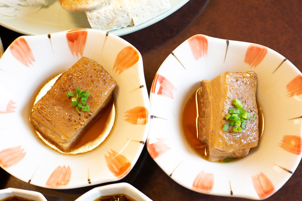 しゃぶしゃぶコース、満足満腹でした。お豆腐はモッチモチで舌の上で出汁がとろける感覚。太めのもずくはラー油と出汁が絡まってるような感じ。こんな仕事のできるお店のラフテーは美味しいに決まってるやん?